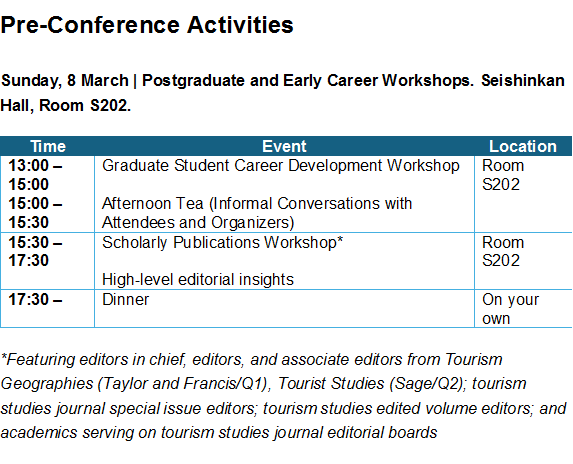 Additionally, editors-in-chief from Tourism Geographies and Tourist Studies will be at the conference and will be seeking ideas for special issues and exemplary papers for submission to these journals.